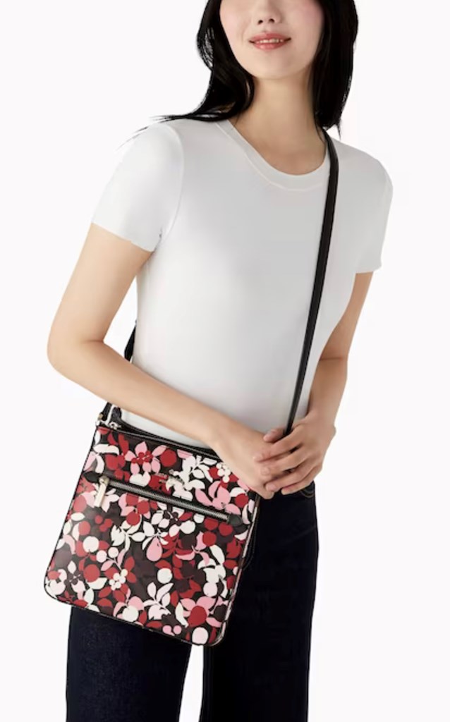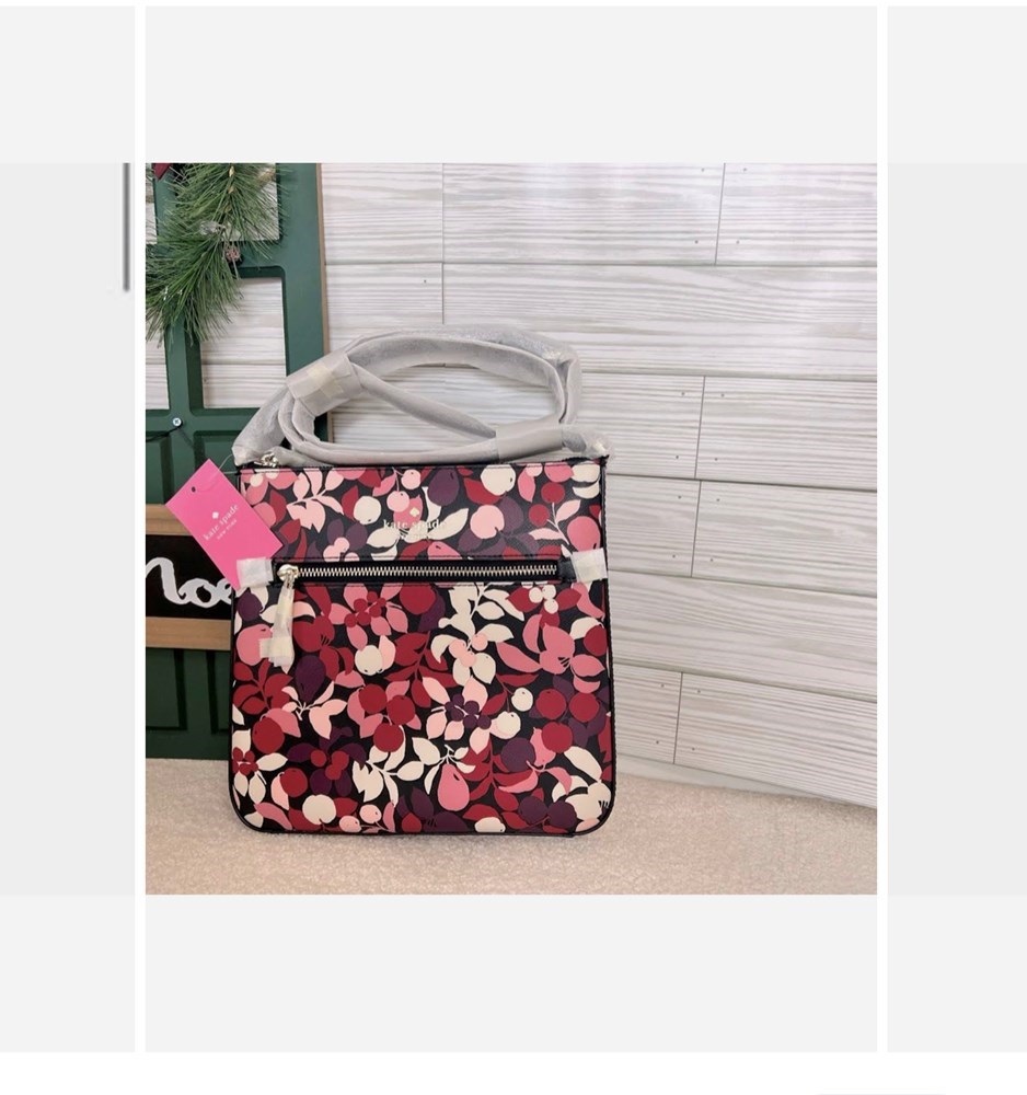 Measurements 9.68" W x 9.4" H x 1.28" D Adjustable strap Colors - Pretty deep berry floral design with silver elements Adjustable strap crossbody bag. Bag is deep but thin so it can fit essential items. Perfect for everyday!